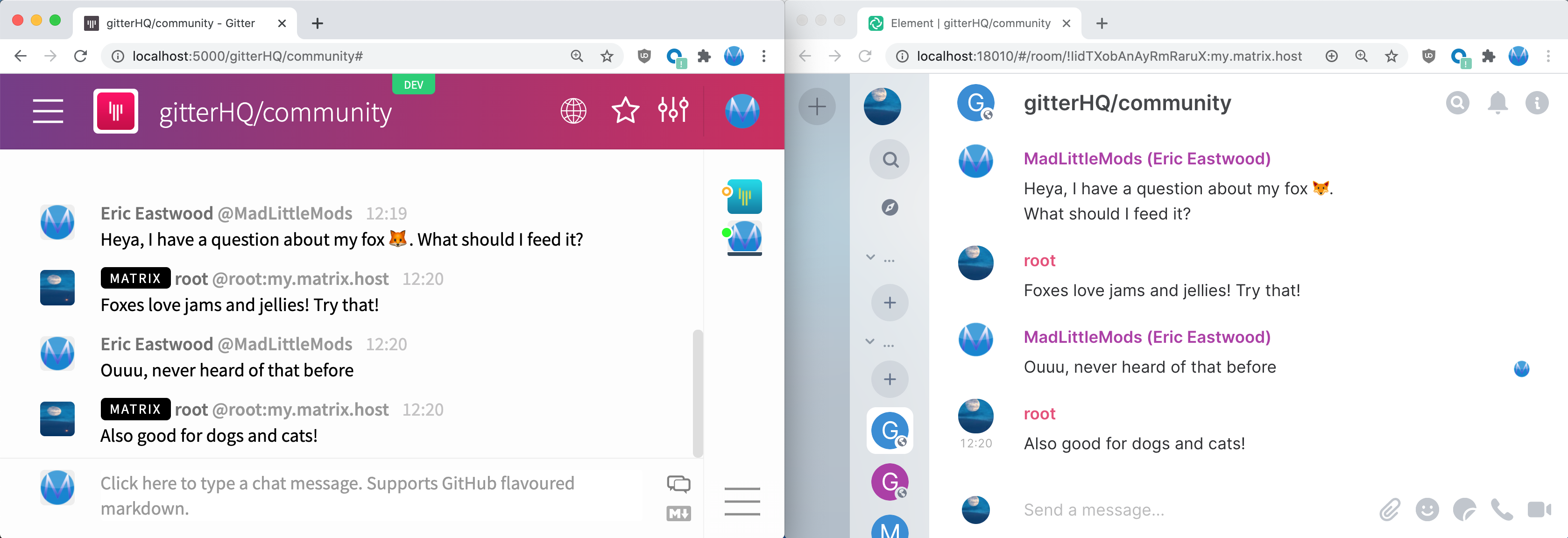 We also have edits from the Gitter side flowing to Matrix and soon to support edits from Matrix. You can track our full progress from the GitLab epic for the native Gitter <-> Matrix bridge.