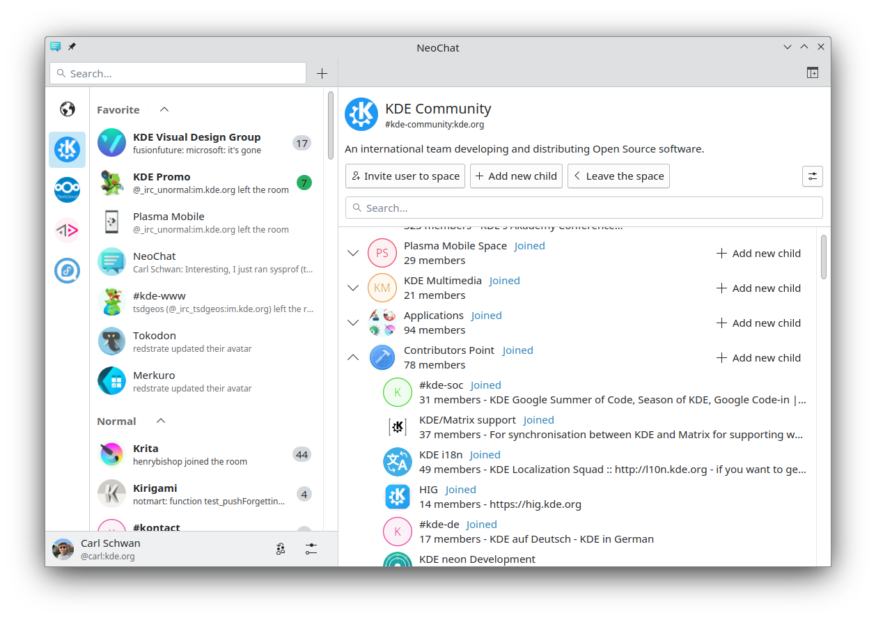 We've landed a major feature in NeoChat this week: There's a now a page showing the subspaces and rooms in a space. This also allows for basic space administration tasks, like adding new rooms to the space. Internally, our Qt6 port is progressing, with all major changes being done now.