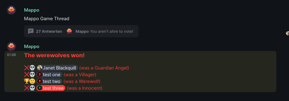 He's a lil noodly jellyfish fella that lets you play the eponymous social deduction game of Mappo where some people are villagers and some people are creatures. The village is trying to figure out who the creatures are to exile them, but at the same time, the creatures are slowly picking them off, one-by-one until they outnumber them! Who wins is determined by who's the best at deducing the truth (or obfuscating it if you're one of the creatures!) The roles range from the conventional like the Seer and Werewolf to the wild and wacky like Cookie Person and Goose.